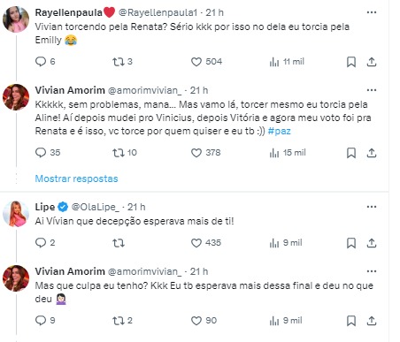 “Vivian torcendo pela Renata? Sério kkk por isso no dela eu torcia pela Emilly”, comentou uma seguidora. Vivian respondeu prontamente: “Sem problemas, mana… Mas vamos lá, torcer mesmo eu torcia pela Aline! Aí depois mudei pro Vinicius, depois Vitória e agora meu voto foi pra Renata e é isso, você torce por quem quiser e eu também”.