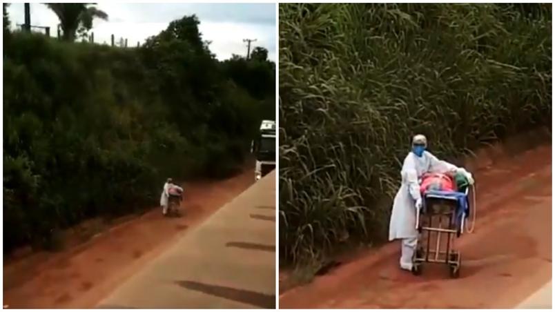 Enfermeira empurra maca com paciente com Covid-19 na rodovia Transamazônica