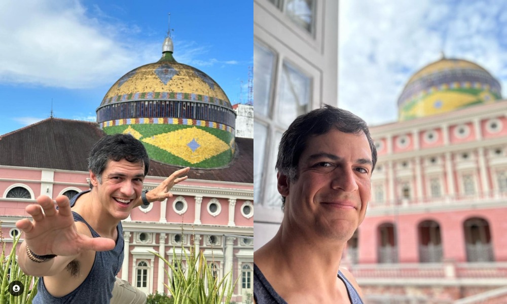 Mateus Solano posa na frente do Teatro Amazonas e participa de evento em Manaus