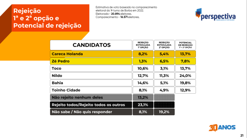 No âmbito da rejeição, o ex-prefeito Baia fica em primeiro lugar com 14,6%. Nildo Colares é o segundo colocado, com 12,7% de rejeição, seguido por Toco Santana (10,6%), Careca Holanda (8,2%), Toinho Cidade (8,1%) e Zé Pedro Graça (1,3%).