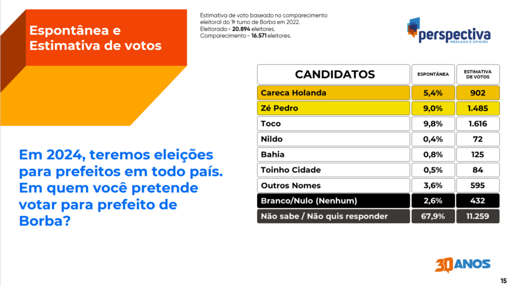 Na pesquisa espontânea, quando são apresentados os candidatos, Careca Holanda fica em primeiro lugar com 29,9% da preferência, seguido pelo vice-prefeito Zé Pedro Graça (23,2%) e Toco Santana (20,3%). Ambos empatam tecnicamente dentro da margem de erro.