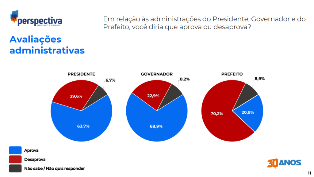 O levantamento divulgado pela Perspectiva Mercado e Opinião para a Prefeitura de Borba aponta que 70,2% dos moradores desaprova a gestão municipal. O comando de Simão Peixoto entre 2021 até sua fuga em prisão em 2023 foi pessimamente avaliado pelos eleitores do município. Apenas 20,9% aprovam a gestão de Peixoto e de seu vice, Zé Pedro Graça (PSD), que assumiu após a prisão do titular.