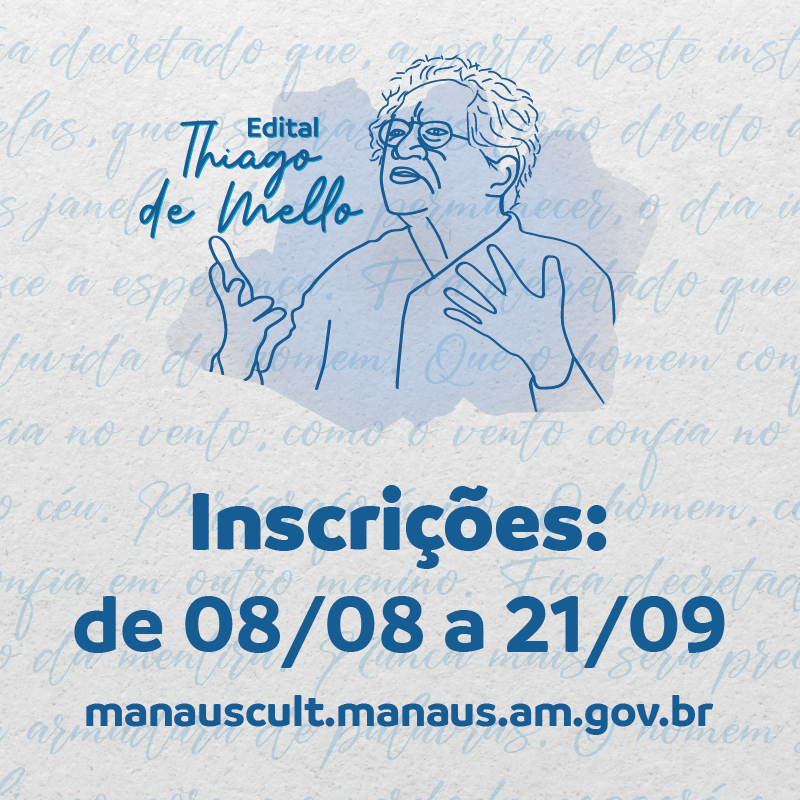 A Prefeitura de Manaus, por meio da Fundação Municipal de Cultura, Turismo e Eventos (Manauscult), lançou o edital de fomento à cultura do “Concurso Prêmio Manaus 2022 Thiago de Mello – Novos Talentos”. O edital vai contemplar até 88 projetos de novos talentos da cultura, em um investimento total de R$ 400 mil, na cadeia econômica cultural de Manaus. As inscrições para os projetos artístico-culturais concorrerem ao edital estão abertas até o dia 23 de setembro.