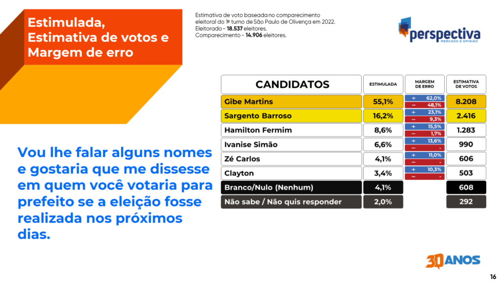 No levantamento estimulado também a aparece o nome de Sargento Barroso (União), liderança local, com 16,2% da preferência. Em terceiro lugar, aparece o ex-prefeito Hamilton Fermin (PSDB), com 8,6%. A professora Ivanise Simão (PCdoB) vem em seguida com 6,6% da preferência.