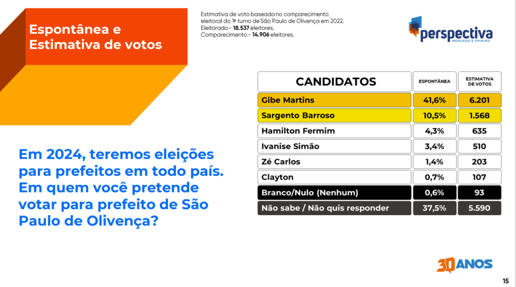 Novato nas eleições de 2020, o prefeito de São Paulo de Olivença, Nazareno Martins, mais conhecido como Gibe (Republicanos), lidera a pesquisa eleitoral divulgada pela Perspectiva Mercado e Opinião nesta segunda-feira (17). Já na pesquisa espontânea, Gibe aparece bom 41,6% de intenção de votos. Na pesquisa estimulada, quando são apresentados os candidatos, o número chega a 55,1%.