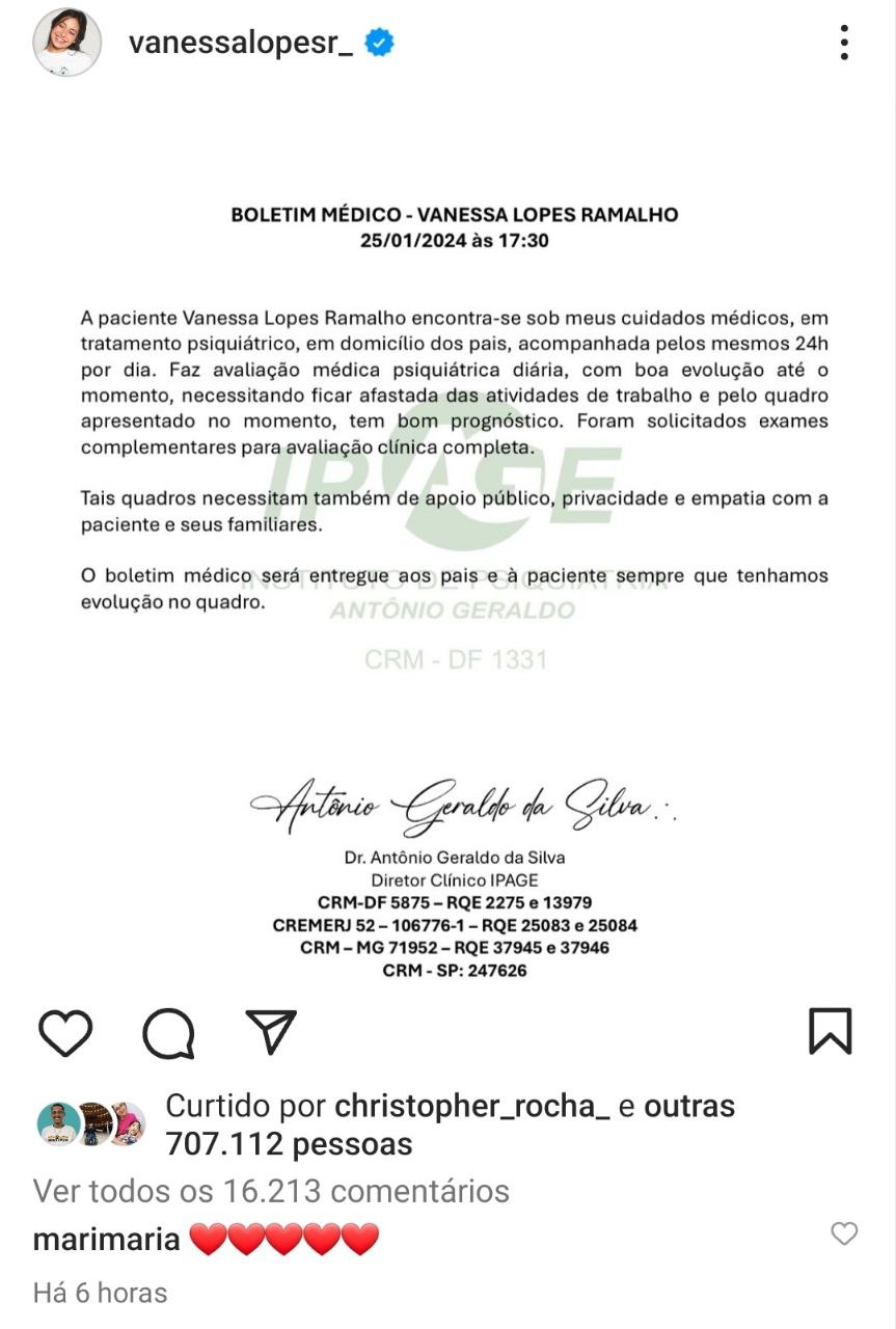 Ainda segundo o médico, o boletim será entregue diariamente aos pais e à própria Vanessa sempre que houver evolução do quadro.