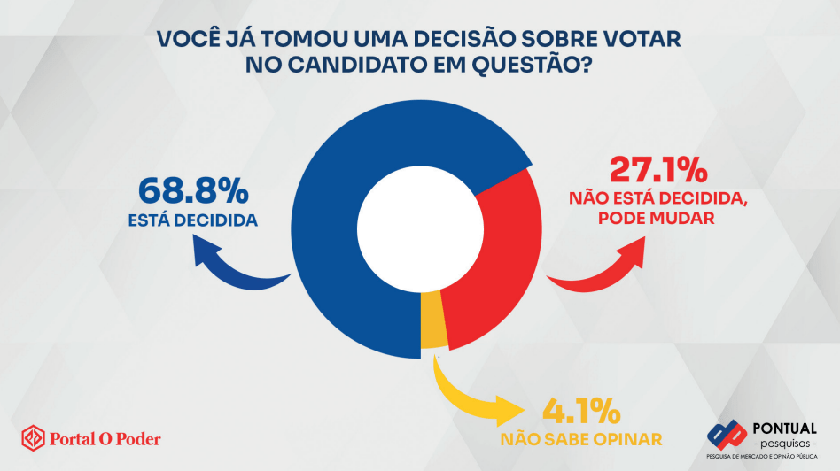 A pesquisa Pontual ainda revela que 68,8% dos entrevistados responderam que estão decididos sobre em quem irão votar para a Prefeitura de Manaus, enquanto 27,1% admitem a possibilidade de mudar de voto. Apenas 4,1% dos entrevistados não souberam opinar.