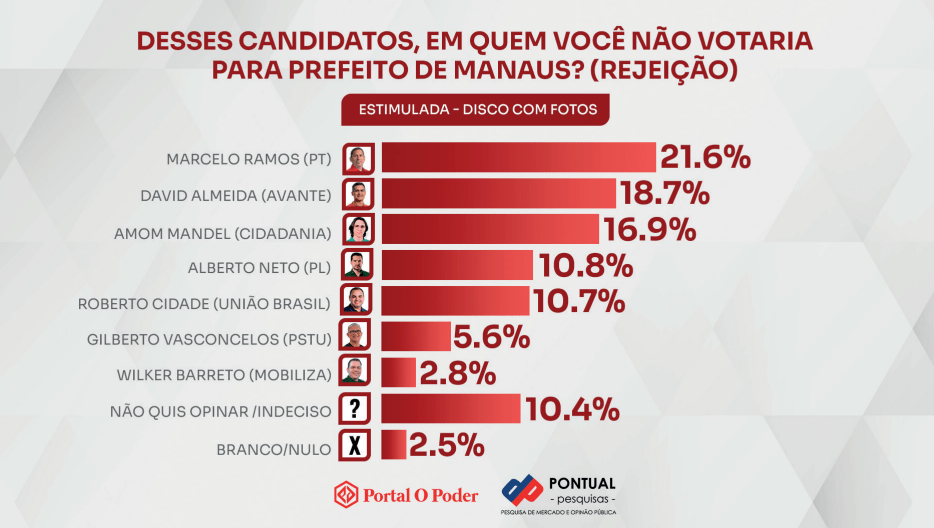 De acordo com o levantamento da Pontual, Marcelo Ramos é o candidato mais rejeitado, com 21,6%. O atual prefeito David Almeida aparece na segunda colocação com 18,7%. Amom Mandel tem 16,9%.