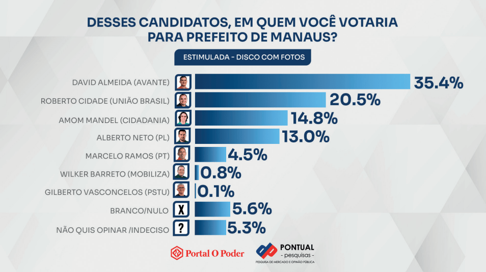 Nesta quinta-feira (3), o Instituto Pontual Pesquisas divulgou mais um estudo eleitoral para a prefeitura de Manaus. Segundo o levantamento, os candidatos Roberto Cidade (União Brasil) e David Almeida (Avante) estão em direção ao segundo turno no pleito deste ano. Almeida aparece com 35,4% das intenções de voto e Cidade possui 20,5%.