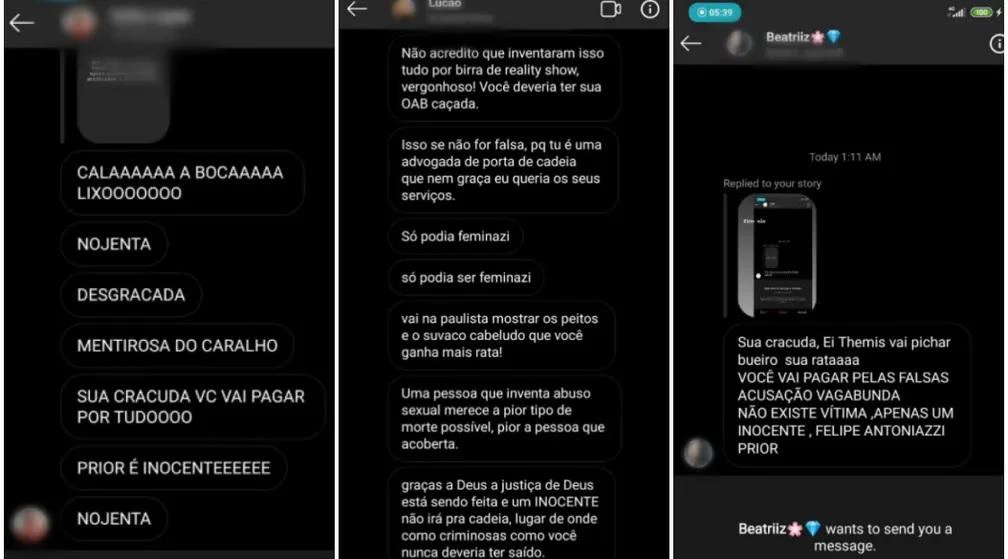 Durante esse tempo, a advogada disse que, em diversos momentos, teve a caixa de entrada de suas redes sociais lotada com mensagens de ódio e xingamentos feitos por fãs de Prior.