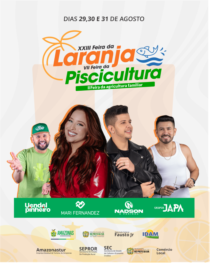 A Feira da Laranja, Piscicultura e Agricultura Familiar 2025, em Rio Preto da Eva, contará com shows de Nadson, o Ferinha, Mari Fernandez, George Japa e Uendel Pinheiro entre os dias 29 e 31 de agosto, no Centro de Eventos. O evento também terá a escolha da Rainha da Feira da Laranja 2025, e a entrada é gratuita.