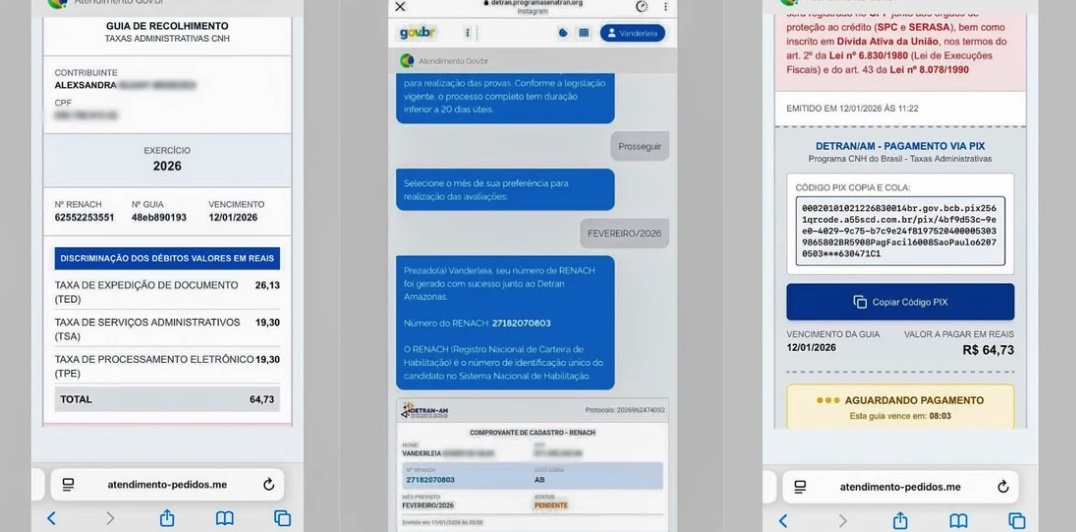 De acordo com o Detran-AM, ao acessar os sites falsos, os usuários são direcionados a um suposto chat automático, no qual são solicitadas informações pessoais e a escolha de serviços. Após o preenchimento dos dados, os golpistas geram um código Pix e exigem pagamento, para dar continuidade ao falso cadastro.