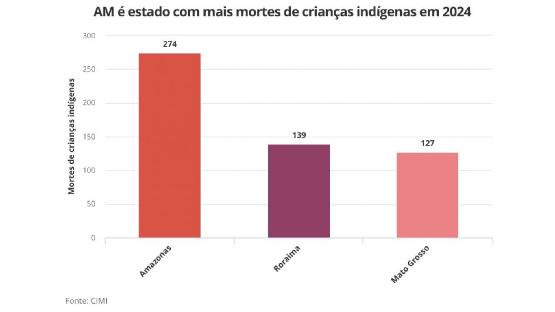 O estado do Amazonas registrou, em 2024, a morte de 274 crianças indígenas de até quatro anos, liderando o ranking nacional pelo segundo ano consecutivo. Os dados são do relatório Violência Contra os Povos Indígenas no Brasil, divulgado pelo Conselho Indigenista Missionário (Cimi) na segunda-feira (28). As principais causas das mortes foram pneumonia (103 casos), diarreia (64) e desnutrição (43) — fatores diretamente relacionados à falta de acesso a serviços básicos de saúde e infraestrutura nas comunidades.