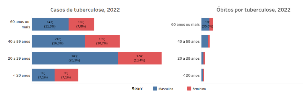 Dos casos registrados, 26,3% foram em pessoas do sexo masculino com idade entre 20 a 39 anos. Nessa mesma faixa etária, 13,4% dos casos registrados foram em pessoas do sexo feminino.