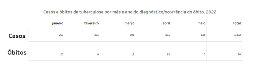 Entre os meses de janeiro a maio de 2022, o estado do Amazonas registrou 1.302 casos de tuberculose. Do total de casos registrados neste período, cerca de 71,97% foram registrados em Manaus, totalizando 937 casos. Até o momento, o mês de março registrou o maior número de casos no estado, sendo 306. Os dados são da Fundação de Vigilância em Saúde do Amazonas (FVS-RCP).