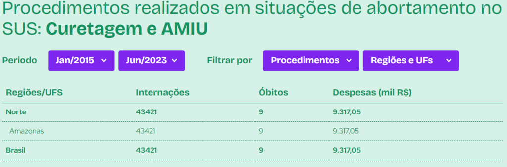 Já na região Norte como um todo, houve 181.958 abortos neste mesmo período. No primeiro semestre de 2023, foram registrados 2.724 abortos, por curetagem ou aspiração manual intrauterina (AMIU) empregados no tratamento ambulatorial do aborto retido ou incompleto.