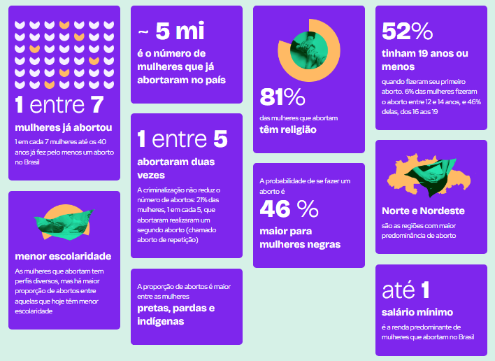 Segundo o Panorama Aborto no Brasil, há maior proporção de abortos entre mulheres que têm menor escolaridade, com renda de até 1 salário-mínimo (R$ 1.320,00), pretas, pardas e indígenas, e residentes nas regiões Norte e Nordeste.
