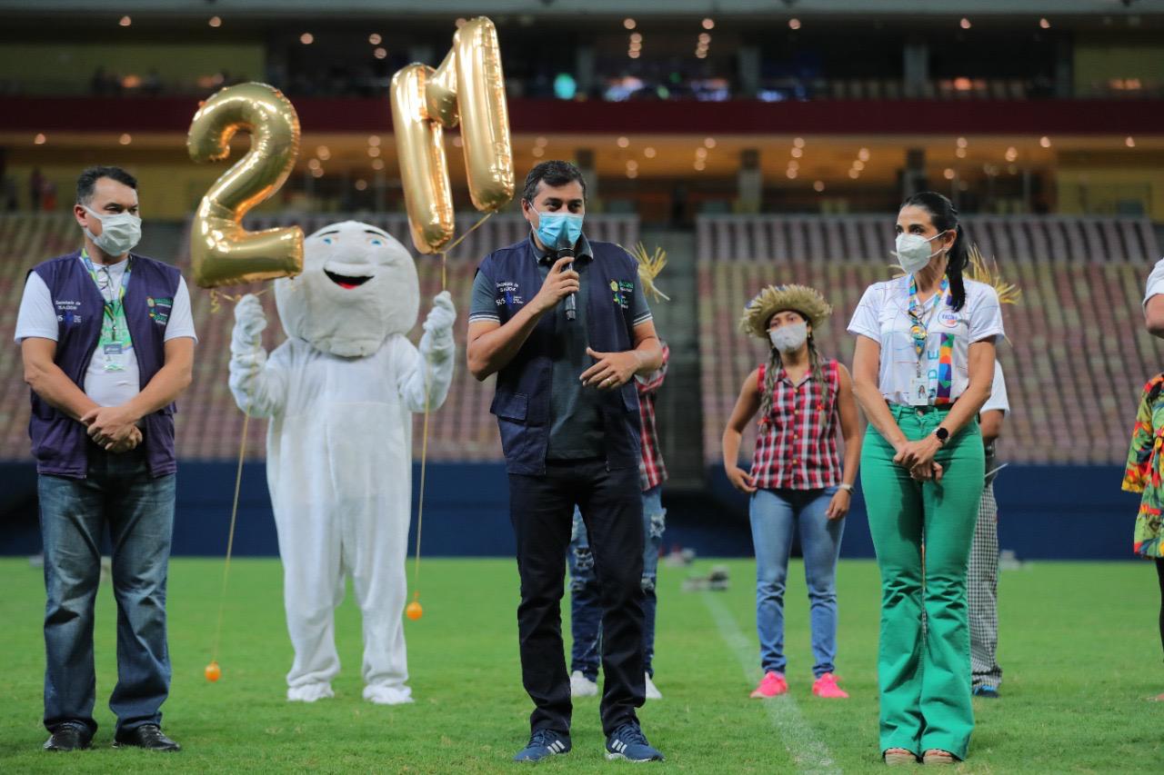 Junto a servidores do Governo do Amazonas e da Prefeitura de Manaus e voluntários, na Arena da Amazônia, o governador Wilson Lima anunciou, nesta quarta-feira (30), que o Amazonas superou a marca de 2 milhões de doses de vacinas contra a Covid-19 aplicadas no Amazonas. Ele também comemorou o resultado do mutirão, encerrado hoje em Manaus, com 58.534 doses aplicadas durante as 24 horas do viradão “Vacina Amazonas”.