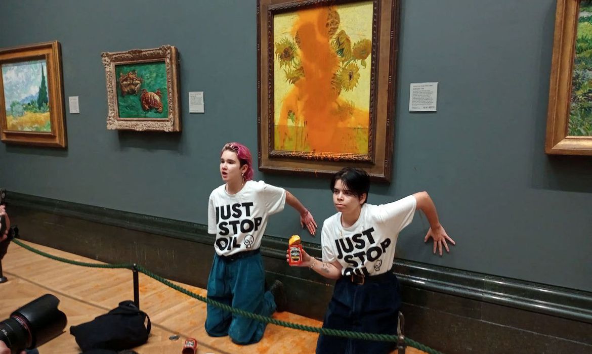 Ativistas do grupo Just Stop Oil, que pede o fim do uso de combustíveis fósseis, jogaram sopa de tomate no quadro “Os Girassóis”, do pintor holandês Vicent Van Gogh, em Londres nesta sexta-feira (14). As manifestantes foram presas.