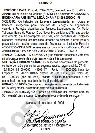 Conforme o extrato contratual, a Viaencosta Engenharia Ambiental será responsável por serviços emergenciais de proteção mecânica de taludes localizados na avenida Mário Ypiranga, bairro Parque 10 de Novembro em Manaus. A empresa executará obras de engenharia com revestimento em geocomposto de PVC, cobertura de proteção mecânica e chapisco jateado de concreto para conter erosões. O valor global do contrato é de R$ 3.323.828,23, com prazo de execução de 90 dias corridos a partir da ordem de serviço.