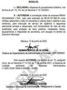 A Prefeitura de Manaus, por meio da Secretaria Municipal de Administração (Semad), dispensou licitação e contratou diretamente a empresa Mirax Segurança Ltda, pelo valor de R$ 20,7 milhões, para prestar serviços de vigilância e segurança patrimonial. A contratação foi oficializada na edição nº 6091 do Diário Oficial do Município (DOM), publicada na última sexta-feira (13). Segundo dados da Receita Federal, a Mirax está ativa desde 2019, possui capital social de apenas R$ 120 mil e tem como único sócio-administrador o advogado Felipe Andrade Monteiro. No endereço cadastrado, na avenida Professor Nilton Lins, 3798, há uma placa da empresa Rastron Monitoramento.