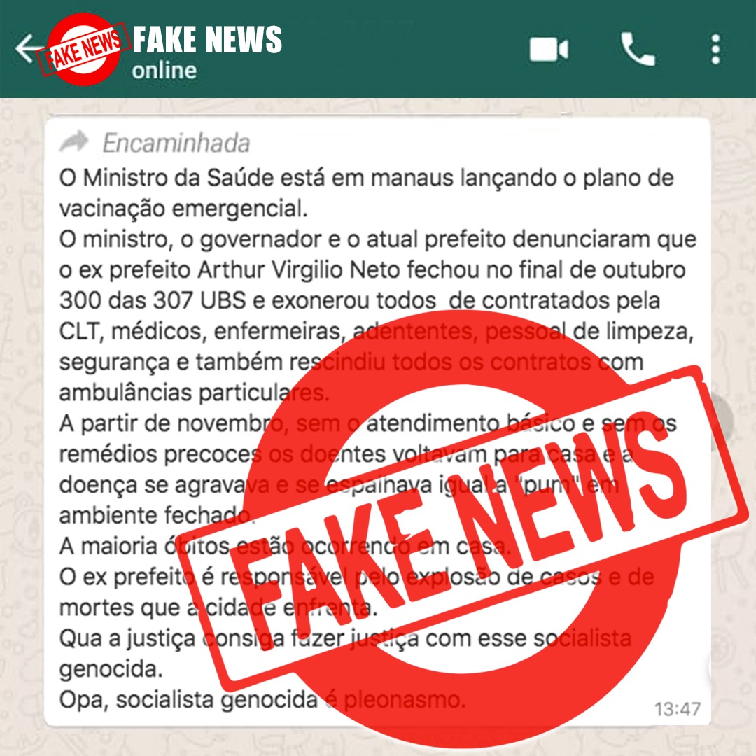 O ex-prefeito de Manaus, Arthur Virgílio Neto (PSDB), esclarece que é falsa a notícia que vem sendo compartilhada em grupos de conversas instantâneas nesta segunda-feira, 11 de janeiro, sobre ter fechado 300 unidades básicas de saúde em outubro do ano passado, quando ainda exercia o cargo de chefe do Executivo municipal, bem como também não procede a demissão de servidores da Secretaria Municipal de Saúde (Semsa).
