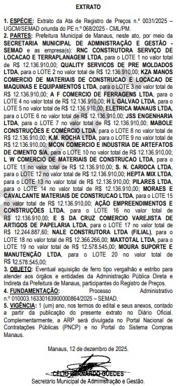 A Prefeitura de Manaus, por meio da Secretaria Municipal de Administração e Gestão (Semad), publicou o extrato da Ata de Registro de Preços nº 031/2025, que prevê até R$ 244 milhões para a eventual aquisição de ferro do tipo vergalhão e estribo. O documento, divulgado no Diário Oficial do Município (DOM), de sexta-feira (19), divide a contratação em 20 lotes entre diferentes empresas, algumas delas já citadas em processos que tramitaram no Tribunal de Contas do Estado do Amazonas (TCE-AM), no Ministério Público do Amazonas (MP-AM) e no Tribunal de Justiça do Amazonas (TJ-AM).