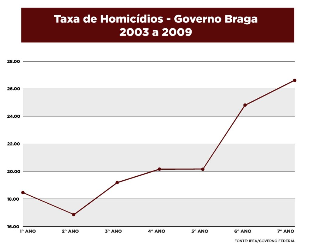 No primeiro ano de Braga no governo, dezembro de 2003, a taxa de assassinatos, no Amazonas, era de 18,41 para cada 100 mil pessoas, já em 2004, o índice reduziu para 16,97, mas apresentou aumento em 2005, com taxa de 18,53.