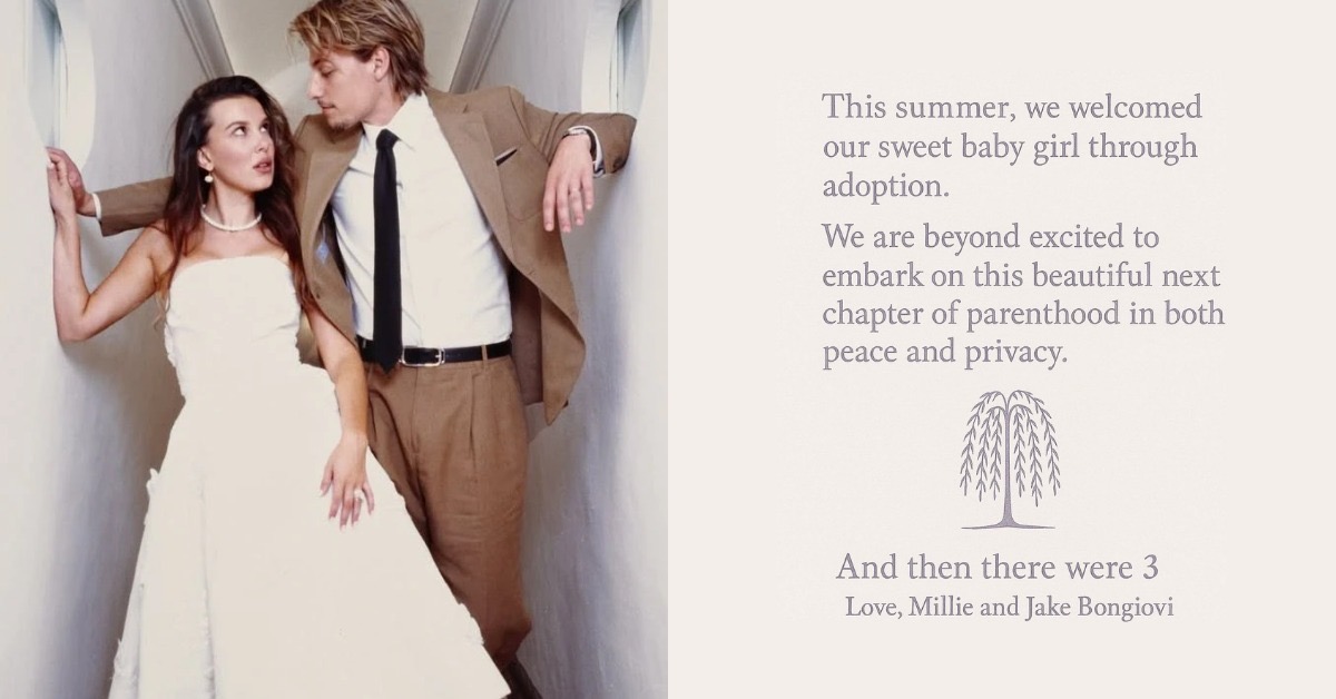 Conhecida por seu papel na série Stranger Thigs, Millie Bobby Brown, 21, anunciou em suas redes sociais, nesta quinta-feira (21), que ela e seu marido, Jake Bongiovi, 23, filho do roqueiro Bon Jovi, adotaram uma menina.