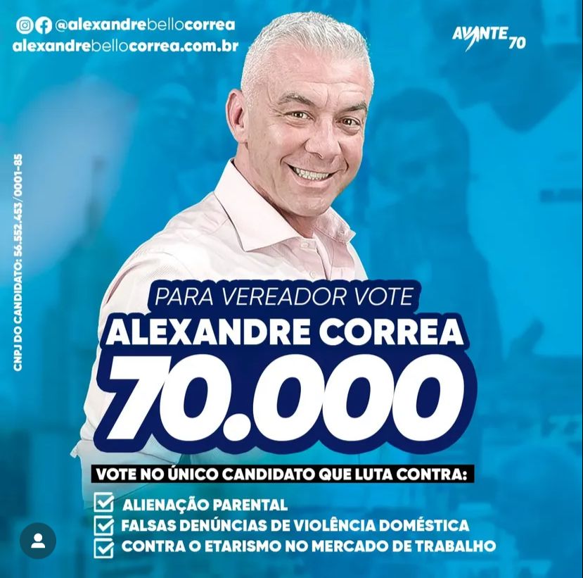 Alexandre Bello Corrêa, tem 54 anos e é empresário. Ficou conhecido por ter sido casado com a apresentadora Ana Hickmann, que pediu o divórcio em novembro do ano passado. Acusado de violência doméstica, o candidato a vereador de SP promete defender o direito dos homens. Declarou R$ 8,6 milhões.