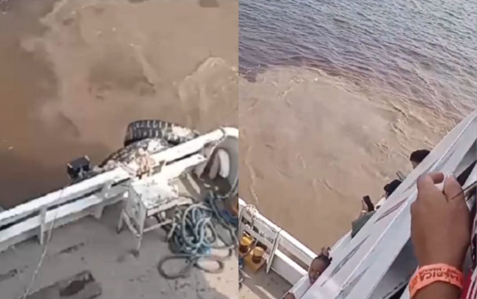 O barco F/B América ficou encalhado, na tarde desse domingo (22), no Encontro das Águas, em frente a Manaus, gerando apreensão entre os passageiros a bordo. Um vídeo que circulou nas redes sociais mostrava uma mulher apontando para a embarcação, enquanto outros passageiros expressavam preocupação com a situação.
