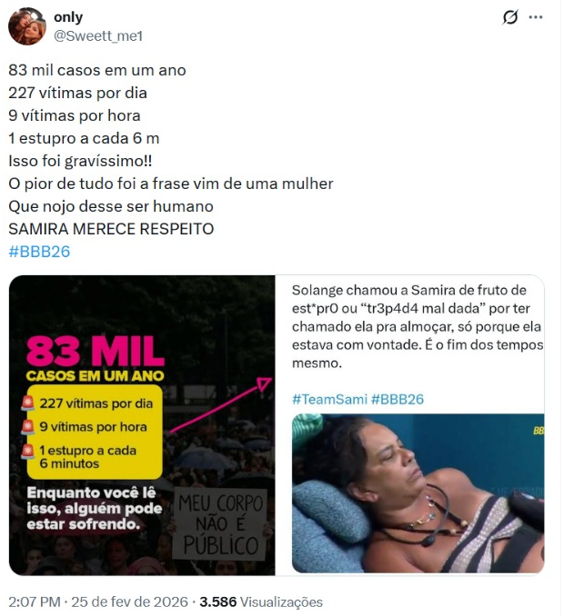 Ainda nesta quarta-feira, a equipe da participante Samira se pronunciou após as falas pesadas de Solange Couto contra a sister. “É lamentável assistirmos a comentários que associam a origem de uma pessoa a um julgamento moral ou de caráter. Nosso papel, como equipe da Samira, é reforçar que essa informação não é verídica. Porém, para além disso, é importante lembrar que esse tipo de fala fere não apenas quem foi diretamente citada, mas também milhares de pessoas que carregam histórias marcadas por violência e que, ainda assim, constroem suas trajetórias com dignidade e coragem”, começa a nota.