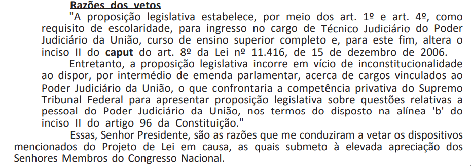 De acordo com o setor jurídico da Presidência da República, o veto ocorreu por entendimento que os dispositivos trariam “vício de inconstitucionalidade ao dispor, por intermédio de emenda parlamentar, acerca de cargos vinculados ao Poder Judiciário da União, o que confrontaria a competência privativa do Supremo Tribunal Federal para apresentar proposição legislativa sobre questões relativas a pessoal do Poder Judiciário da União”.