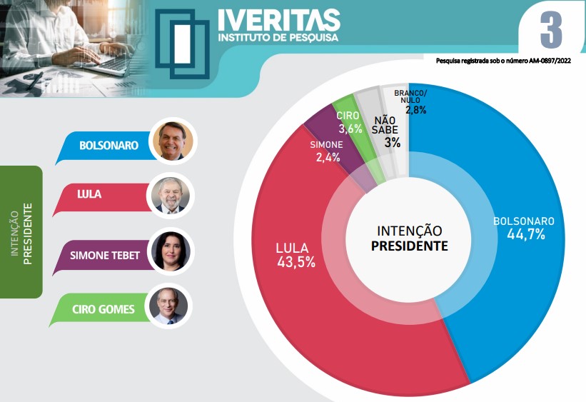 Desbancando Lula (PT), a pesquisa afirma que Bolsonaro tem 44,7% das intenções de votos, enquanto o adversário fica em segundo lugar com 43,5% pontos.