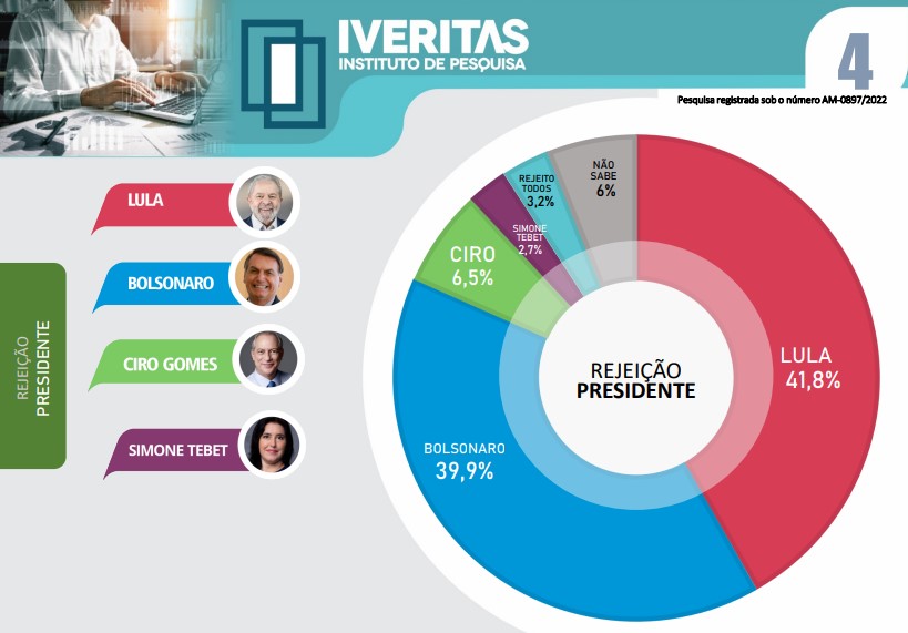 Além de analisar em quem os amazonenses gostariam de votar, o Instituto Iveritas também perguntou aos entrevistados quais dos candidatos são rejeitados por eles, e neste quesito, Lula vence com 41,8%, e Bolsonaro fica com 39,9%.