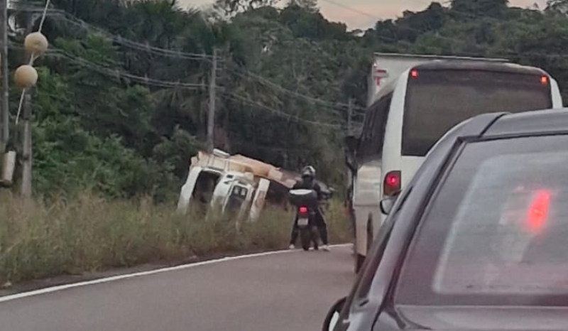 Vídeos que circulam nas redes sociais mostram o caminhão tombado e o fluxo de veículos seguindo de forma lenta na região.