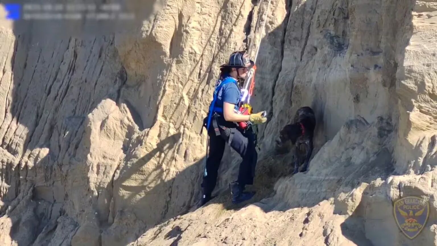 De acordo com o Corpo de Bombeiros de São Francisco, o cão, de pelagem marrom, ficou preso em uma saliência rochosa logo abaixo do topo do penhasco. Os bombeiros usaram cordas para alcançar o animal, enquanto uma câmera aérea registrava toda a ação.