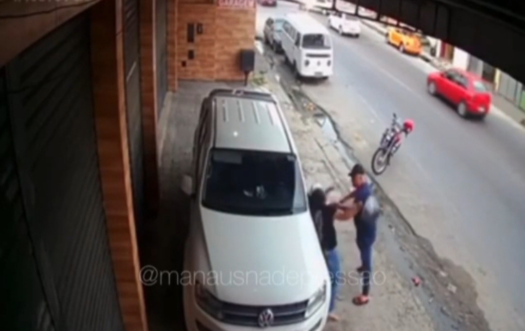 No bairro Cidade de Deus, zona Norte de Manaus, câmeras de segurança flagram momento em que um homem agride uma mulher, por volta das 17h da tarde do último domingo (11).