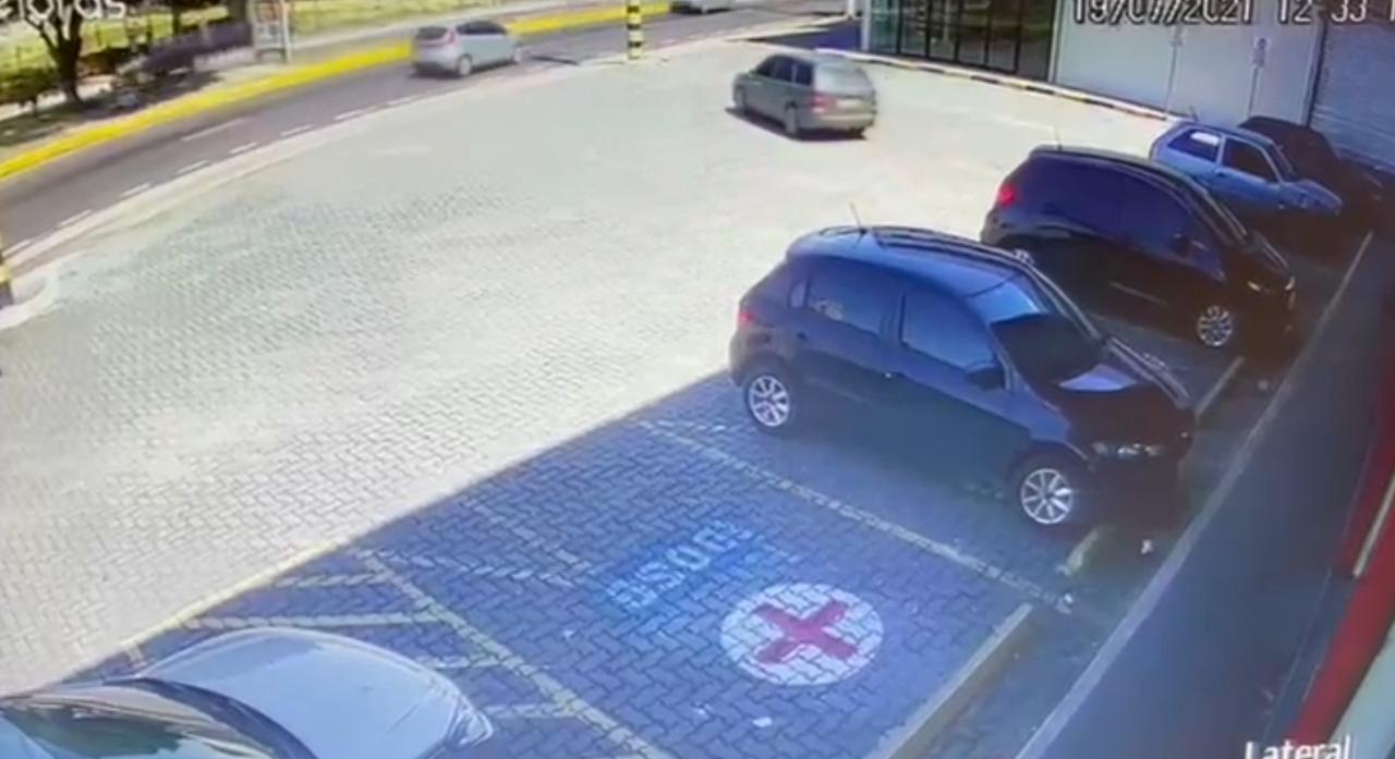 Nas imagens é possível ver o carro da vítima, um Honda Fit preto adentrando o estacionamento da drogaria. Logo atrás, um outro veículo modelo Parati de cor verde, estaciona ao lado do Honda Fit.