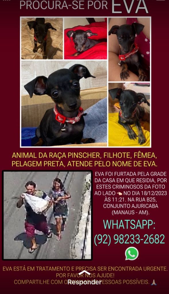 De acordo com a dona da cadela, alguns comerciantes próximos do local afirmaram que o casal sempre anda pelas redondezas. Testemunhas também relataram que o suspeito que furtou o animal é conhecido como ‘Papagaio’.