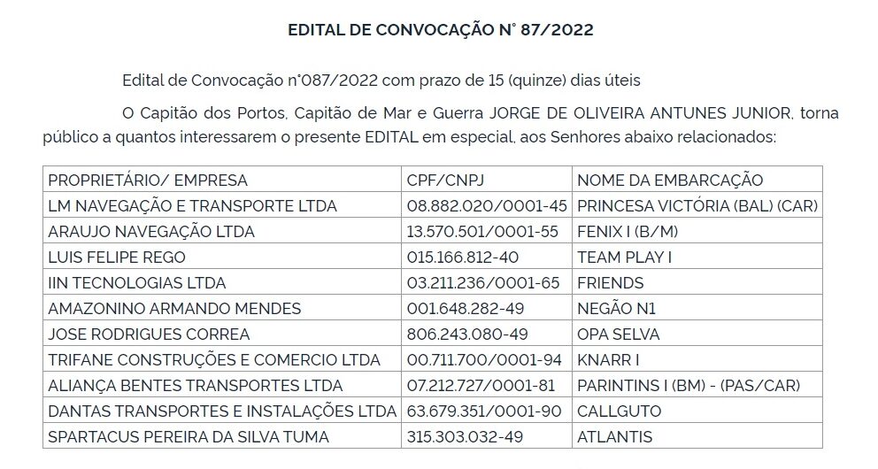 É válido dizer que os proprietários das 10 embarcações foram convocados por não cumprirem com a Lei 9.537, de 11 de dezembro de 1997, e o Regulamento aprovado pelo Decreto nº 2.596, de 18 de maio de 1998, além da Lei nº 8.374, de 30 de dezembro de 1991.