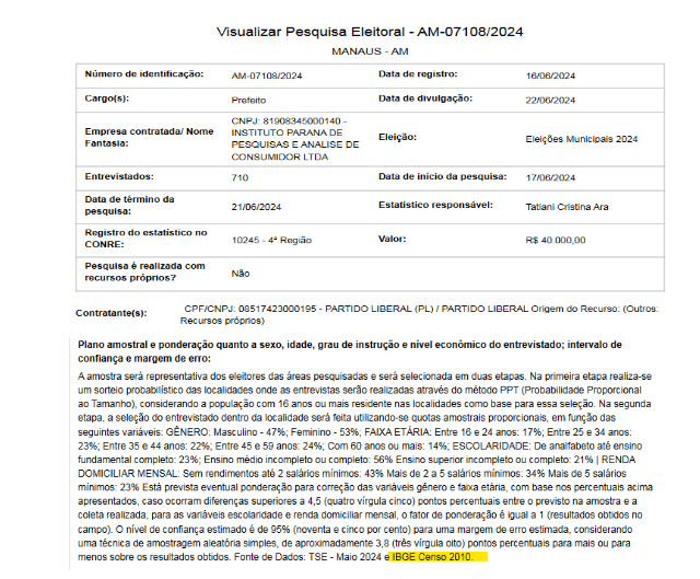 A Paraná Pesquisas registrou no dia 16 de junho a pesquisa AM-07108/2024 para a Prefeitura de Manaus, utilizando dados atualizados do TSE Maio 2024 e do Censo de 2010 do IBGE. Este estudo, contratado pelo PL por R$ 40 mil, pagos com recursos públicos pelo fundo partidário, estava programado para ser divulgado, mas foi subitamente retirado dos registros do TSE e não será mais publicado.