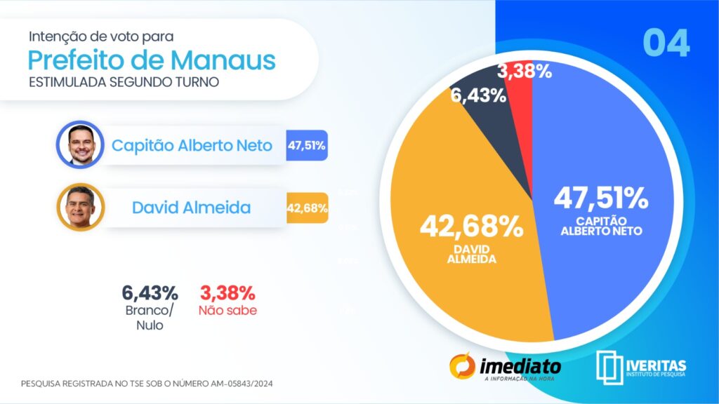 Às vésperas do segundo turno que decidirá o novo prefeito de Manaus, a pesquisa divulgada nesta quarta-feira (23) pelo Iveritas Instituto de Pesquisa, aponta que o candidato Capitão Alberto Neto (PL) lidera a disputa, contando com 53% das intenções de voto, contra 47% de David Almeida (Avante).