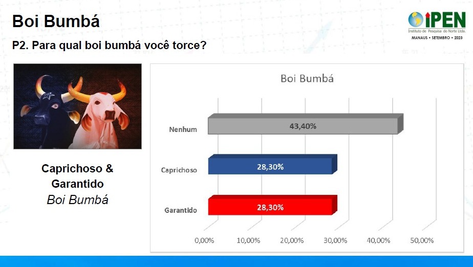 Pesquisa feita pelo Instituto de Pesquisa do Norte (Ipen) mostrou que em Manaus a torcida é dividida entre os bois Caprichoso e Garantido, com percentual de 28,3% de preferência para cada bumbá. Já a maioria, 43,4% declarou torcer por nenhum dos bois de Parintins.