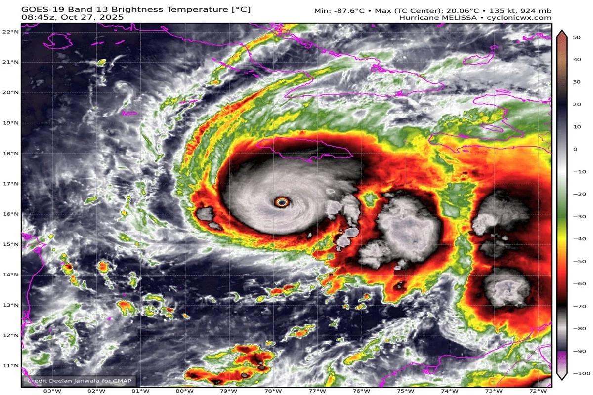 “Melissa ganhou força e se tornou um furacão de categoria 5, com ventos de 257 km/h e pressão central de 917 mb, confirmado pelos Caçadores de Furacões da Reserva da Força Aérea. As condições na Jamaica piorarão rapidamente ainda hoje e à noite. Aqui estão as principais mensagens detalhes mais recentes”, comunicou o Centro Nacional de Furacões dos EUA.