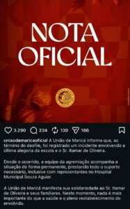 A União de Maricá informou que acompanha o estado de saúde dos feridos e presta suporte às vítimas e familiares. As circunstâncias do acidente devem ser apuradas pelas autoridades e pelos organizadores do desfile.