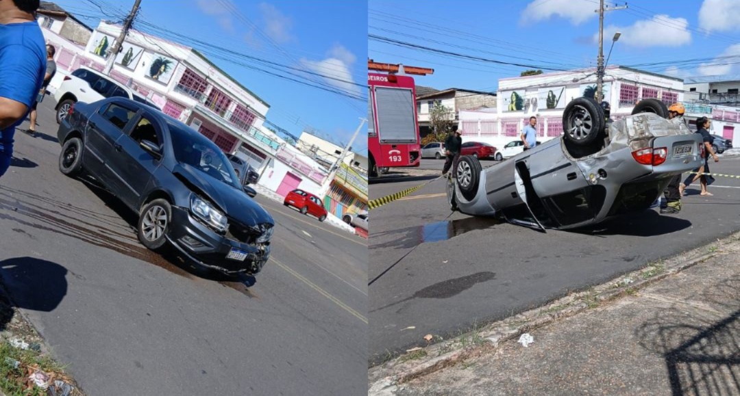 Uma manobra imprudente transformou o pacato cruzamento das ruas Carmen Miranda e Urucará, no bairro Cachoeirinha, em um cenário de caos na manhã desta sexta-feira (1º). Câmeras de segurança flagraram o momento em que um Chevrolet Classic, ignorando um sinal de “PARE”, tentou uma ultrapassagem arriscada e acabou capotando após ser atingido por outro veículo.