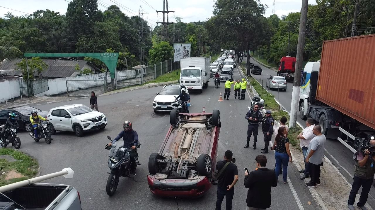 Um acidente entre um Fiat Mobi e uma picape Montana deixou o trânsito lento, na manhã desta quinta-feira (9), na avenida Rodrigo Otávio, bairro Japiim, zona Sul de Manaus. Com o impacto da colisão, o Mobi capotou no meio da pista.