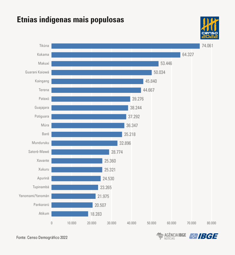 A etnia Tikúna permanece como a mais numerosa do país, com 74.061 pessoas, seguida pelos Kokama (64.327) e Makuxí (53.446). Por outro lado, 21 etnias possuem menos de 15 integrantes. O caso dos Kokama é emblemático: o grupo quase triplicou de tamanho desde 2010, reflexo da reafirmação identitária e da migração de indígenas provenientes do Peru, onde também habitam o rio Amazonas.