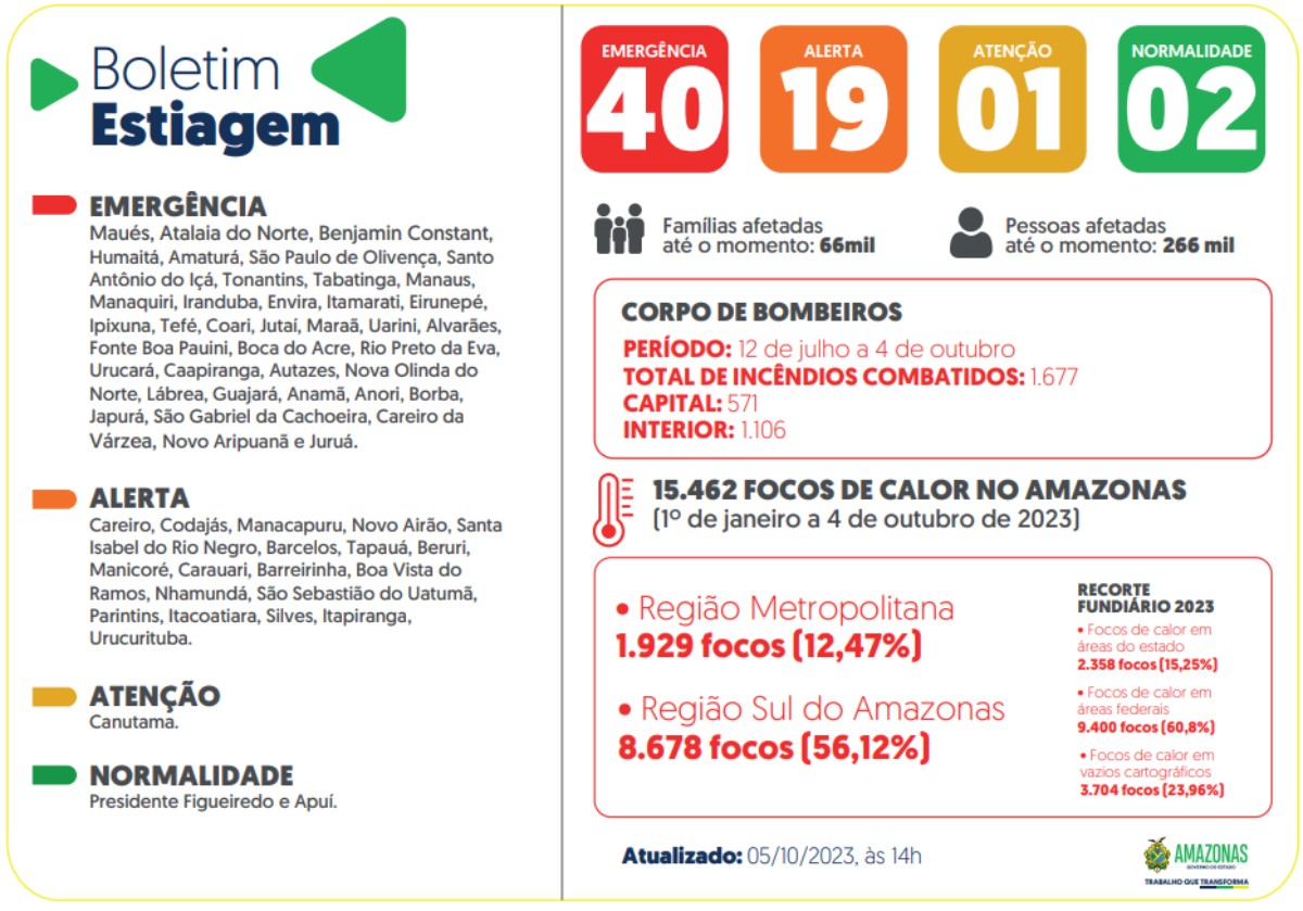 O Amazonas atualizou nesta quinta-feira (5), o Boletim Estiagem, onde divulgou que mais de 66 mil famílias estão sendo afetadas pela seca, representando um aumento de cerca de 1.6 mil desde a última atualização.